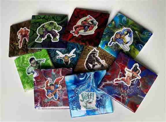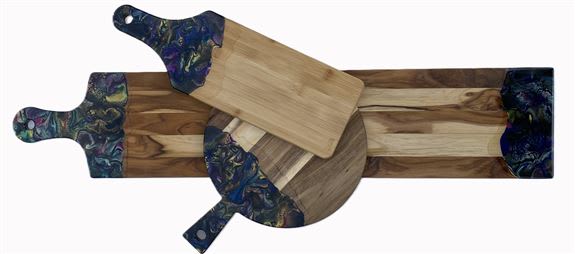 For the pieces of art that might touch food or heat (turntables aka "Lazy Susan's, coasters, serving trays, entertaining & charcuterie boards) a special type of resin is used that is "Food Safe" and is also "High Temperature" resistant to 450° F .